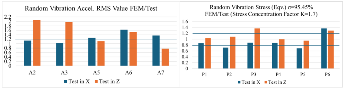 The results from the random vibration simulation using the FE, in terms of acceleration and stresses compared to those obtained from the testing campaign, are illustrated in Figure 8. A ± 20 % accuracy band is presented to evaluate the quality of the model against the empirical test results.