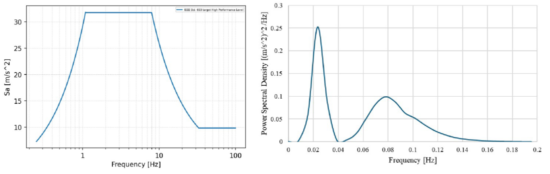 Figure 11 – Simulated loading environments using the validated FE model. Left: High Performance Level, target Response Spectrum for 2 % damping of the IEEE Std. 693-2018 [9]. Right: Exemplary Long-term acceleration PSD Spectrum based on metocean data and hydrodynamic studies of a floating unit