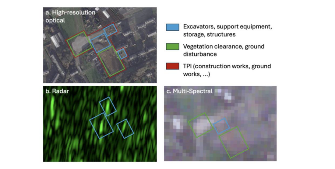 The combination of satellite sources ensures all components of a third-party activity are detected. A third-party indicator (TPI) consists of multiple components such as equipment on site and often a decrease in vegetation. As highlighted in Figure 2, radar satellites, multi-spectral and high-resolution satellites capture all components of relevant activities. Figure 3 shows an example of groundworks visible in a high-resolution optical satellite image. Different elements of the activity are detected by the radar and multi-spectral satellites. The fusion of the different sources allows the system to identify these groundworks, which in this case are confirmed by the optical image.