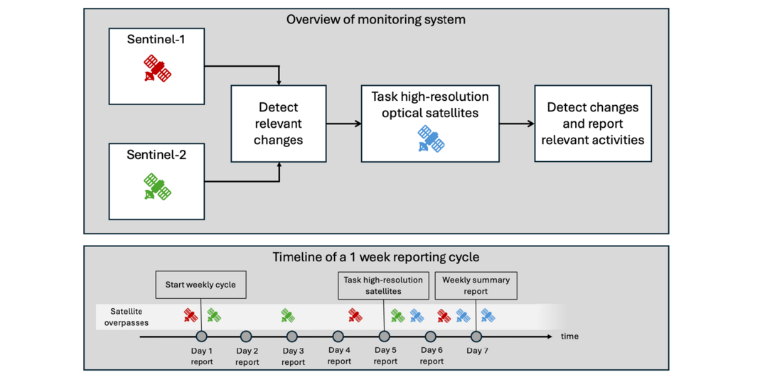 An overview of a reporting cycle is shown in figure 1. Sentinel-1 and 2 data are analysed on almost a daily basis. Once the high-resolution satellites are tasked then also these satellites start to acquire data over the network where relevant activities are taking place. Firstly, Sentinel-1 and Sentinel-2 imagery is ingested into the system. An advanced change detection algorithm filters all irrelevant changes. Next, high resolution optical satellites actively task and collect images near all relevant changes. Finally, the relevant locations together with recent high resolution optical images are reported. The illustrated timeline shows an example of a standard reporting week. Satellite data is ingested on almost a daily basis. Relevant activities are reported daily, and a final summary report is gathered at the end of the cycle.