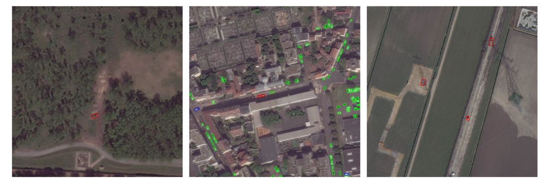 Figure 4 - Example of vehicle detection model detecting excavators (red), vehicles (green) and trucks (blue) in high-resolution optical images. From left to right, an excavator is detected in a remote area indicating starting groundworks, two excavators are detected indicating ongoing road works and three excavators are detected near overhead lines. (© 2025 Maxar, © 2025 Maxar, (© Airbus DS (2025))