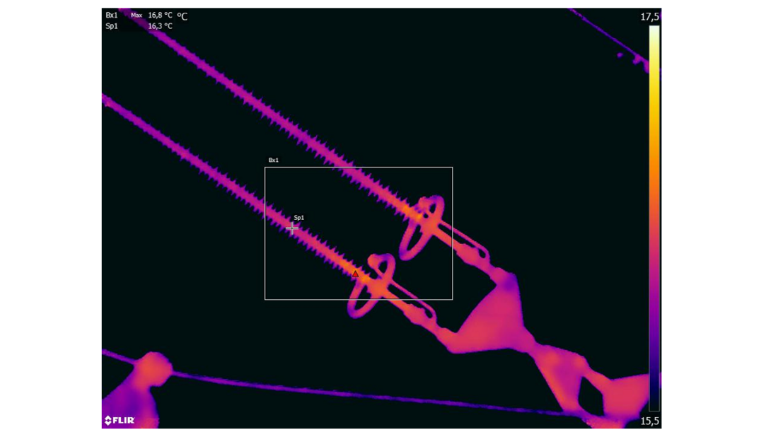 Known service experience from one of the overhead lines, where several insulator failures occurred, triggered the inspection of insulators from the same batch installed on another line. These were approximately 30-year-old insulators. The previously removed insulators (from the other line) had been tested and were found to exhibit poor quality in both the rod material and the interface between the rod and the housing. These samples failed both the water diffusion test and the dye penetration test, as standardized in IEC 62217 [15]. On the inspected line, the insulators were installed as V-string sets to support the jumper loop at tension towers. For all 44 inspected insulators, the temperature difference (ΔT) exceeded 1 °C. The ΔT values ranged between 1 °C and 7 °C, indicating internal damage affecting between 8% and 23% of the insulating length. One IR image is shown as an example in Figure 16.