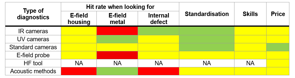 Table 1 - Diagnostics methods rated to find excessive electric field on insulator housing (E-field housing), excessive electric field on protective devices (E-field metal) and internal defects where GREEN illustrates full applicability, YELLOW acceptable applicability, and RED colour illustrates non-acceptance for specific application.