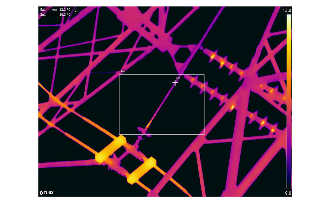 A thorough analysis of infrared (IR) results is often necessary, and it requires cross-checking with other diagnostic techniques. At one specific tower, minor heating (ΔT < 1°C) was observed near the end fitting on several insulators. This could be due to dielectric losses in the high electric field region, but it may also indicate the early onset of internal activity. Dielectric losses tend to increase in areas with high electric fields, which suggests poor electric field grading. In this case, however, the heating was spread across several sheds along the insulator, which is not typical. Normally, dielectric losses are spread to the smaller portion of the trunk of an insulator near the HV fitting, rather than extending along its entire length. Example of this is shown in Figure 13.