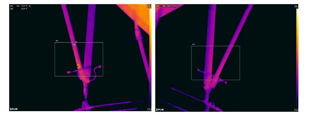 Figure 14 - Heating close to high voltage end fitting that indicate internal activity (left) compared to neighbouring insulator set (right), colour scale: 15,5 – 17,5 °C