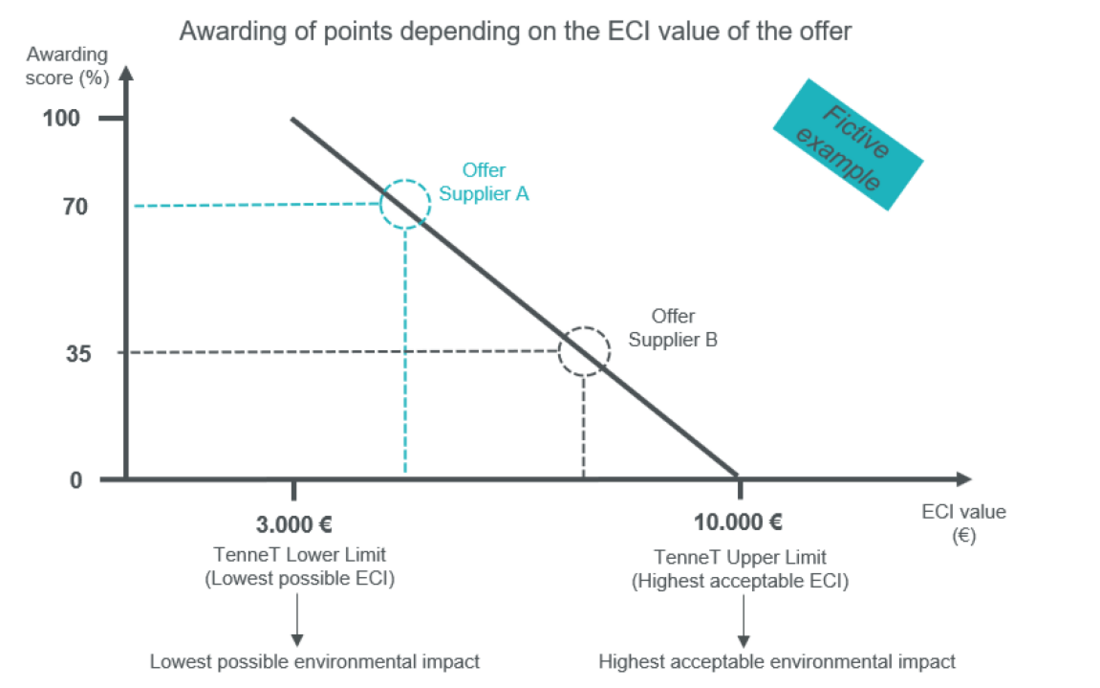 Then the supplier can make their own calculation in a provided ECI template, in the same way as TenneT defined the upper and lower limit. With their outcome we can simply define the ECI score which is part of the MEAT discount that can be awarded (Figure 2).