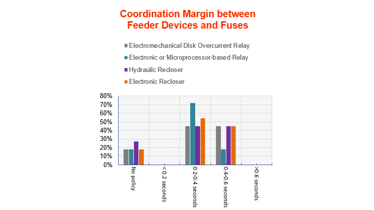 0.2-0.6 sec is the most common time frame used by the respondent utilities as the coordination margin between bus and feeder relays. Survey recipients were also asked to indicate the minimum coordination time margin between their feeder protective device time current curve and a downstream fuse total clearing time. The answers for the different types of the feeder protective device are summarized in Fig.11.