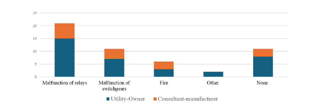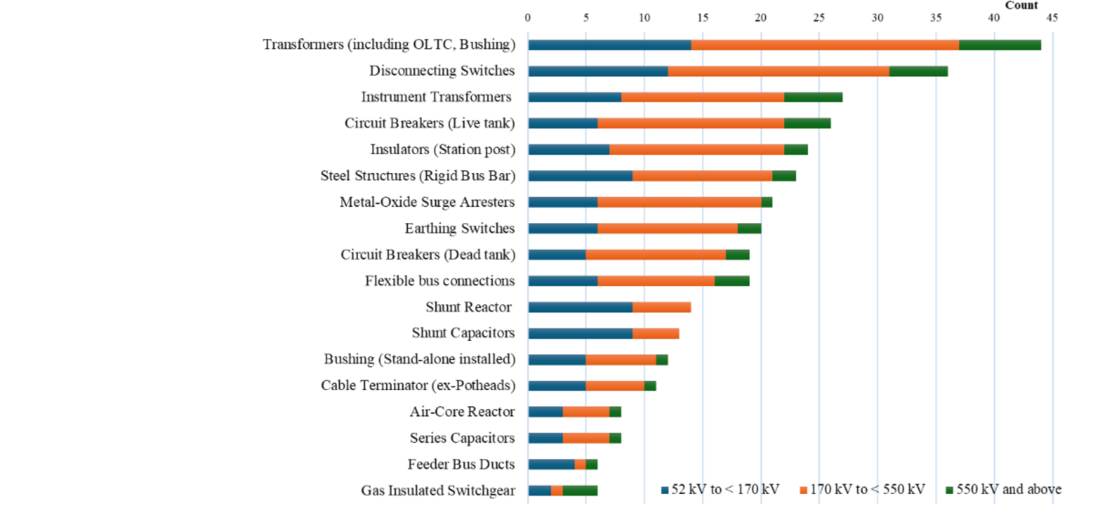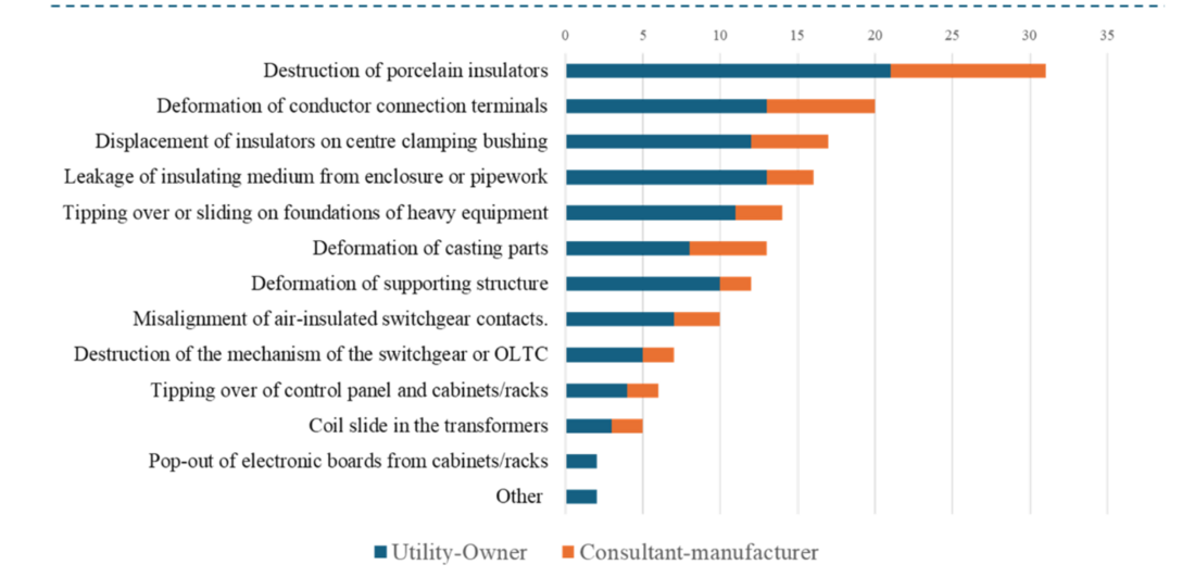 A closer analysis of the survey responses revealed that insulation damage was the most frequently reported issue, encompassing a variety of problems such as the destruction of insulators, displacement of centre clamp bushings, and leaks in insulating mediums. Overhead line terminal deformations were also identified as a prominent failure mode. Power transformers were particularly vulnerable, with common issues including the breakage of foundation bolts, misalignment of centre clamp bushings, and insulator damage.