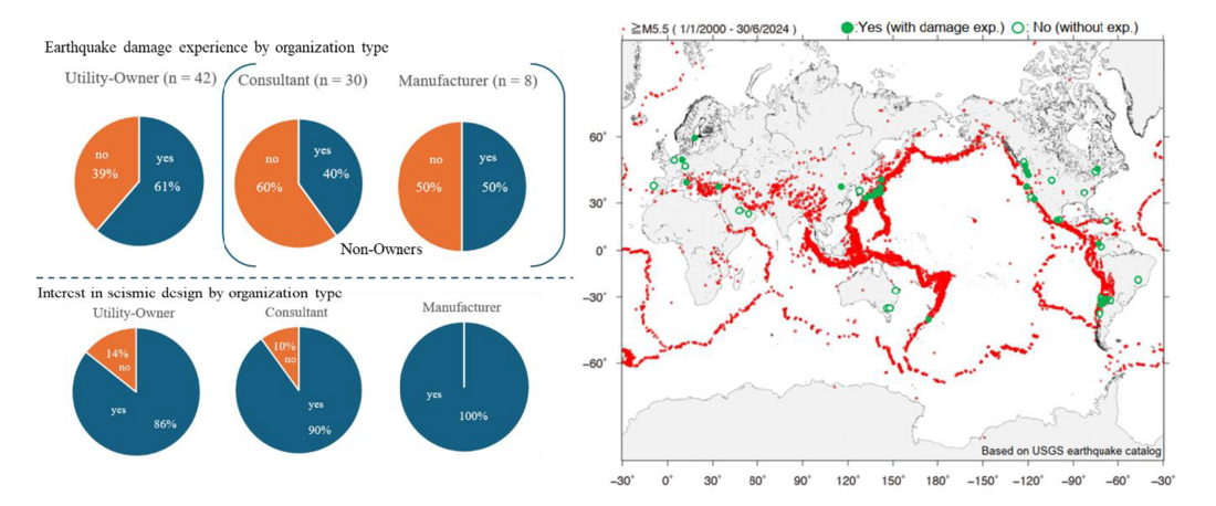 Figure 1 – Earthquake damage experiences by organization type, left: experiences and/or concerns regarding seismic design of substation equipment, right: significant earthquakes (Mw ≥ 5.5) worldwide since the year 2000, overlaid with respondents' damage experiences