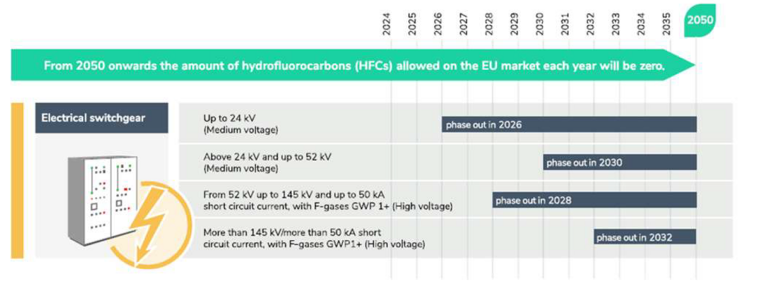 Within the EU, F-gas regulations have been involved in a series of revisions over the past decades starting with the 2006 regulation, strengthened in 2014, and further revised in 2024 with Regulation (EU) 2024/573, aiming for a phased reduction and eventual phase-out of HFCs by 2050 (European Partnership for Energy and the Environment, 2024). A rigorous evaluation of the regulation revealed that the major change is the timeline instructing how all new products will begin phasing out of SF6 by 2032 as shown in figure 3.