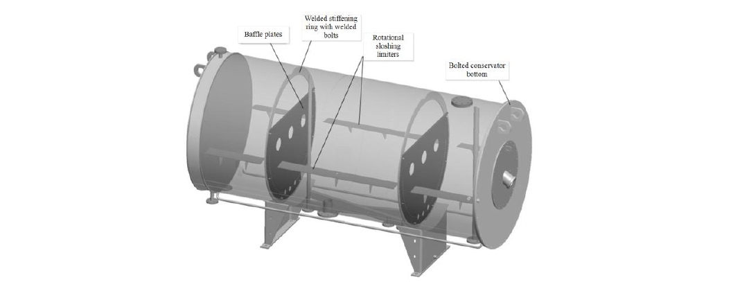 For use in floating-applications, the baffle plates were reinforced again. To prevent rotational sloshing, sloshing limiters are also attached to the jacket of the cylindrical vessel (see Figure 12).