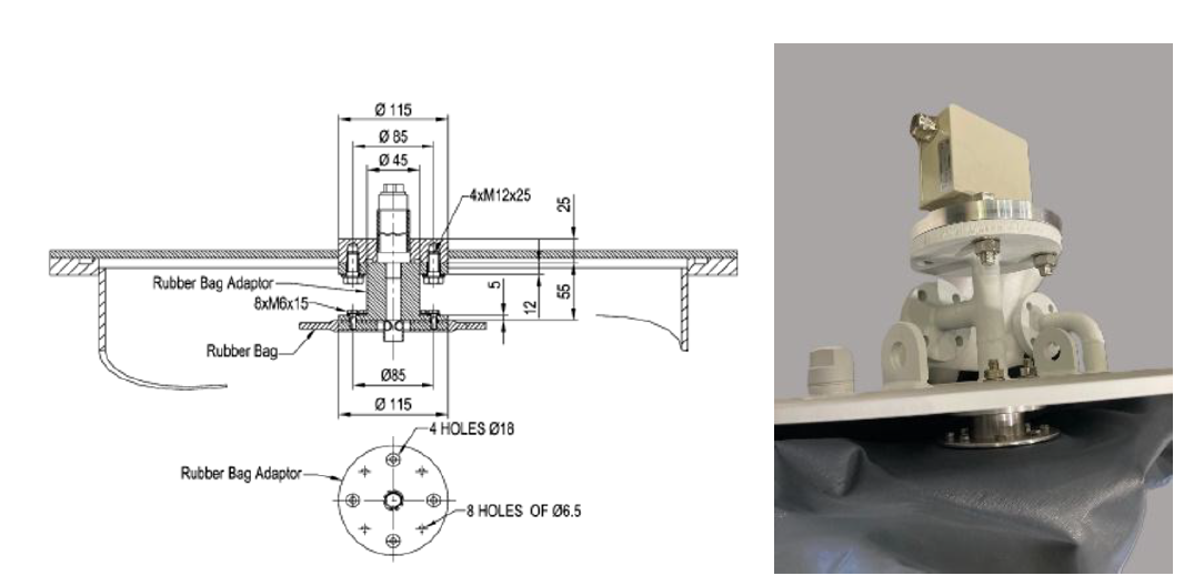 Figure 14 – Flange and pipe design with passage for UV sensor for level monitoring when using a rubber bag