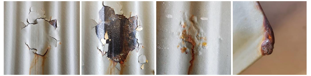 Figure 23 – Damage to radiators after the corrosion test Left - Infiltration and flaking of the paint structure Center – Blistering due to underlaying rust Right – Damage to the edges